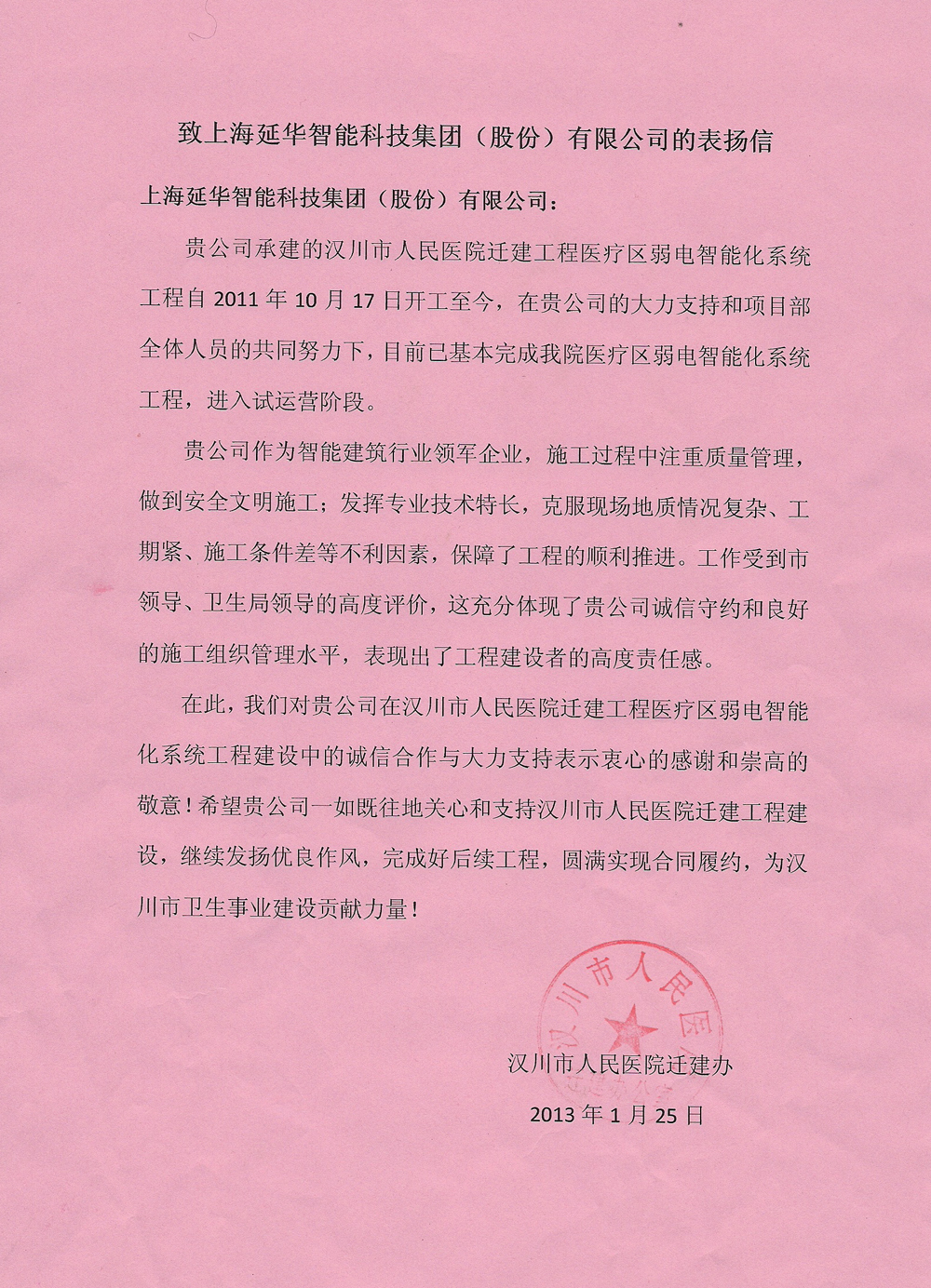 精益求精抓质量 全力以赴保工期——汉川市人民医院致延华集团表扬信 |