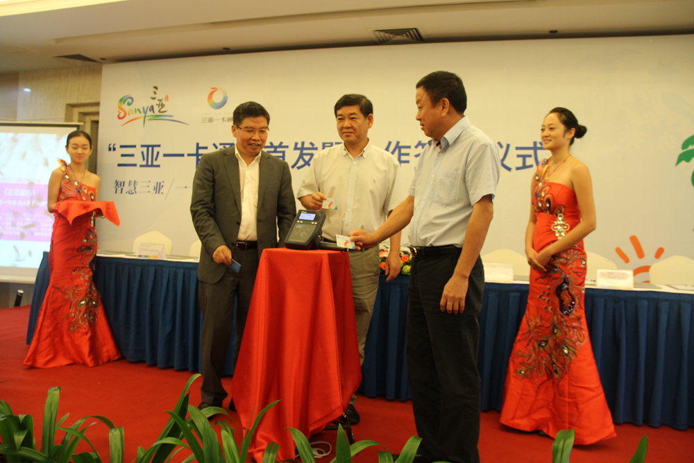 在圆满结束为期三个月的试运行后,9月18日上午11点,“‘三亚一卡通’首发暨合作签约仪式”在三亚湘投银泰酒店隆重举行。三亚市委副书记、常务副市长吴岩峻,市政府副市长李柏青,“三亚一卡通”承建运营单位——海南智城科技股份有限公司的5位股东代表:三亚市政府国有资产监督管理委员会主任任熙德、上海延华智能科技集团股份有限公司董事长胡黎明、三亚智慧城市一卡通发展有限公司董事长孙冬、武汉光谷科技有限公司董事长李儒雄、江苏金茂创业投资管理有限公司财务总监刘雅菱,海南智城副总经理张勇、海南智城一卡通运管中心副总经理关景火及经营班子出席签约仪式。