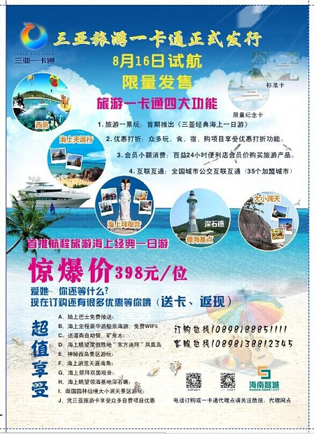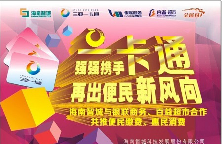 ![]() 【2013年9月18日,“‘三亚一卡通’首发暨合作签约仪式”隆重举行】 ![]() 【2014年4月,三亚一卡通有了自主充值点,市民可以在农业银行全市的16个网点自助充值圈存】 ![]() 【2014年7月,海南智城三亚一卡通与银联商务、百益超市共推便民缴费、惠民消费举措】 ![]() ![]() ![]() 【2014年8月,海南智城三亚旅游一卡通正式发行】 ![]() ![]() 【10月1日三亚公交一卡通即时打折系统升级,正式上线运行】 ![]() 三亚一卡通将把公交惠民利民工程进行到底,让市民游客切实体验到智慧海南带来的便利和实惠!
