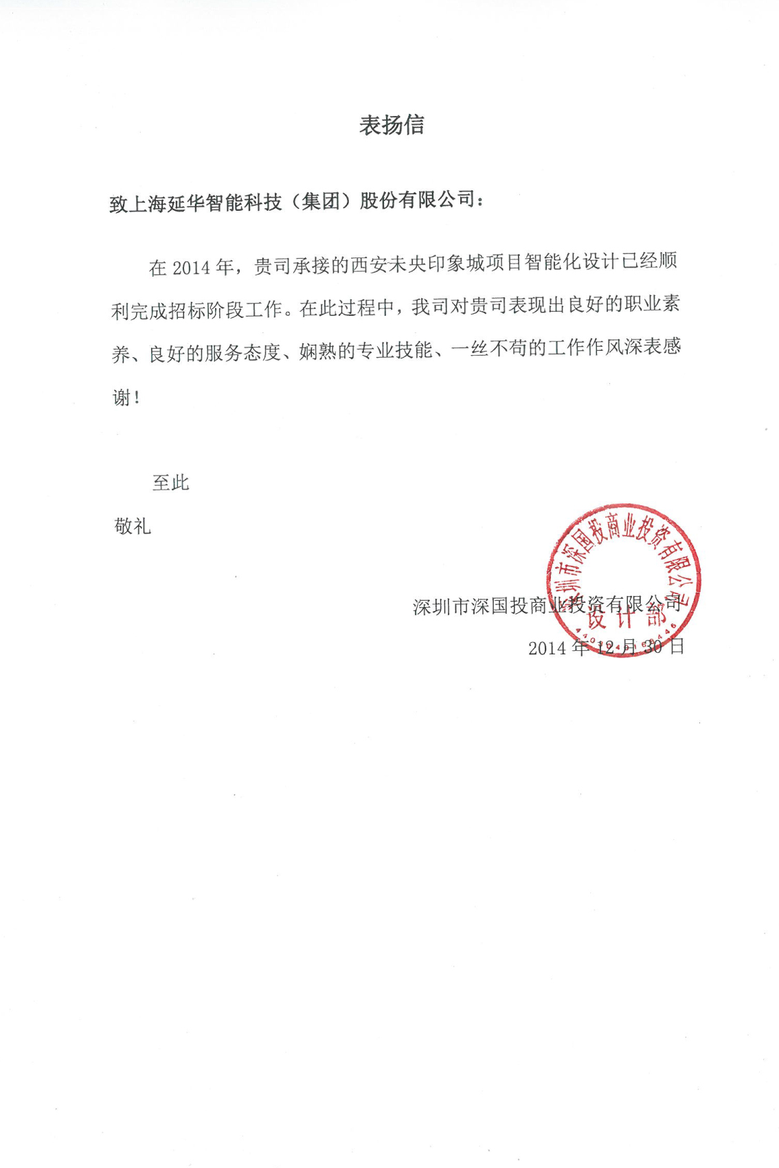 深圳市深国投商业投资有限公司致延华集团表扬信 |