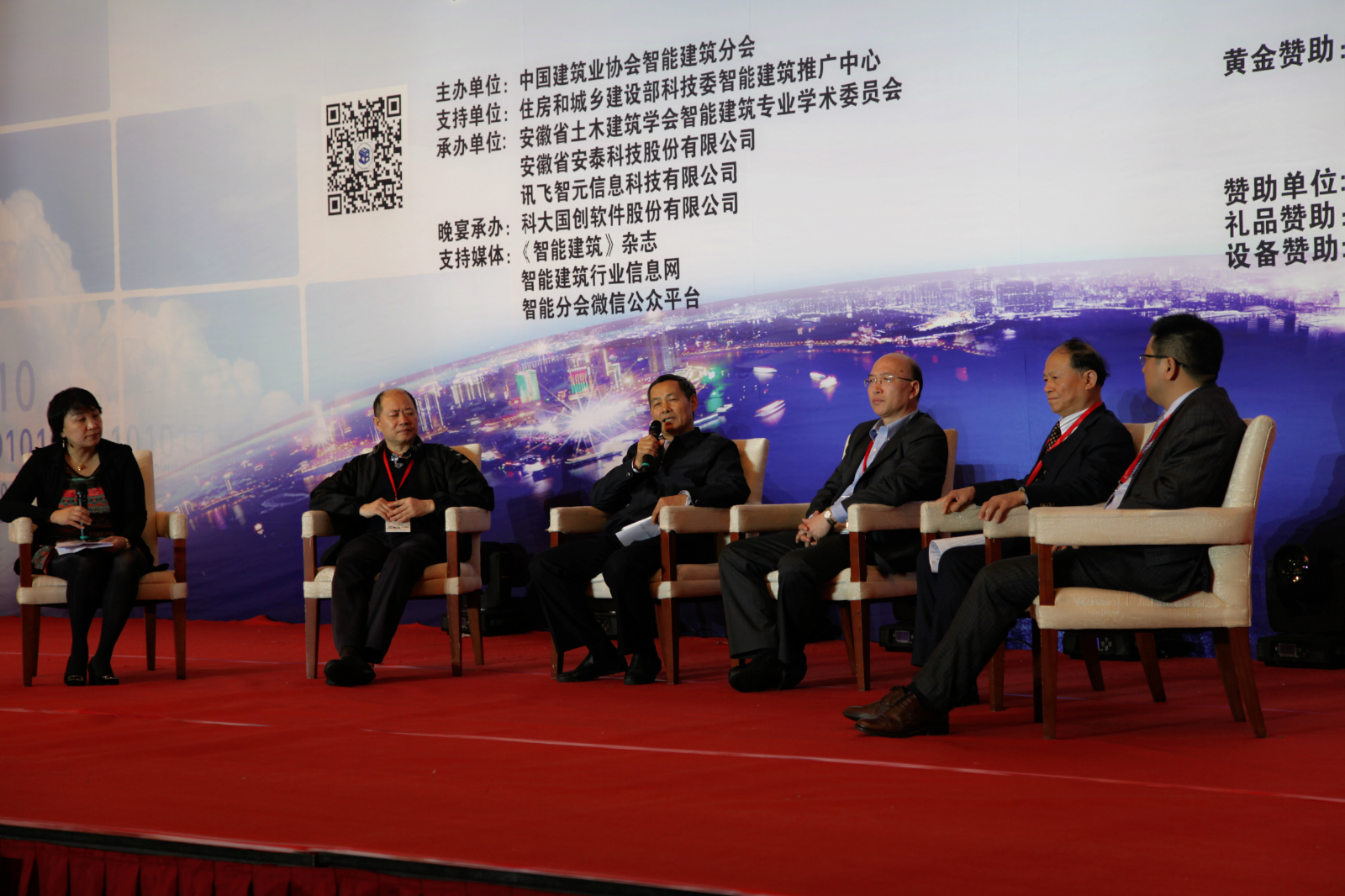 在简约而隆重的年会之后,2015智能建筑行业发展高峰论坛启幕,“高峰面对面——行业创新发展”由《智能建筑》杂志执行主编苏玮主持,延华集团执行总裁、总工程师王东伟与中建协智能建筑分会会长黄久松、上海大学自动化系教授赵哲身、华南理工大学建筑设计研究院总工程师耿望阳、安徽讯飞智元信息科技有限公司总经理张友国一起与行业人士共同探讨创新发展之路。 苏主编以李克强总理提出的“互联网+”引出主题,