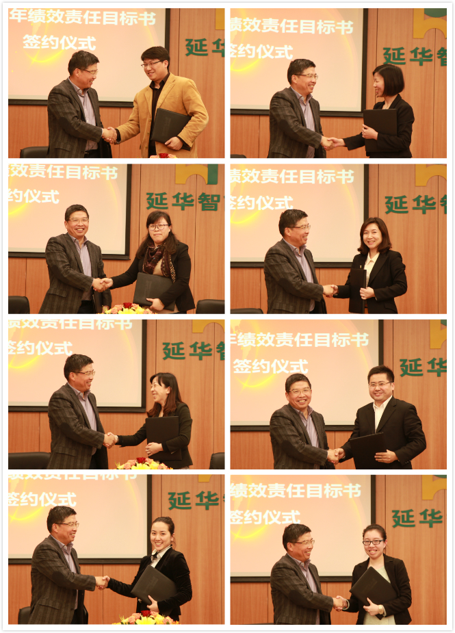 3月27日下午,延华集团举行了2015年度绩效考核指标签约仪式,集团各业务板块、职能部门负责人与公司正式签署了2015年度绩效考核目标责任书。延华集团管理顾问陈敏恒先生、执行总裁顾燕芳及各条线核心骨干见证签约。签约仪式后,每位绩效指标承担人相继汇报了各自所承担的指标内容,并结合公司发展战略和所负责板块的规划部署作发言。