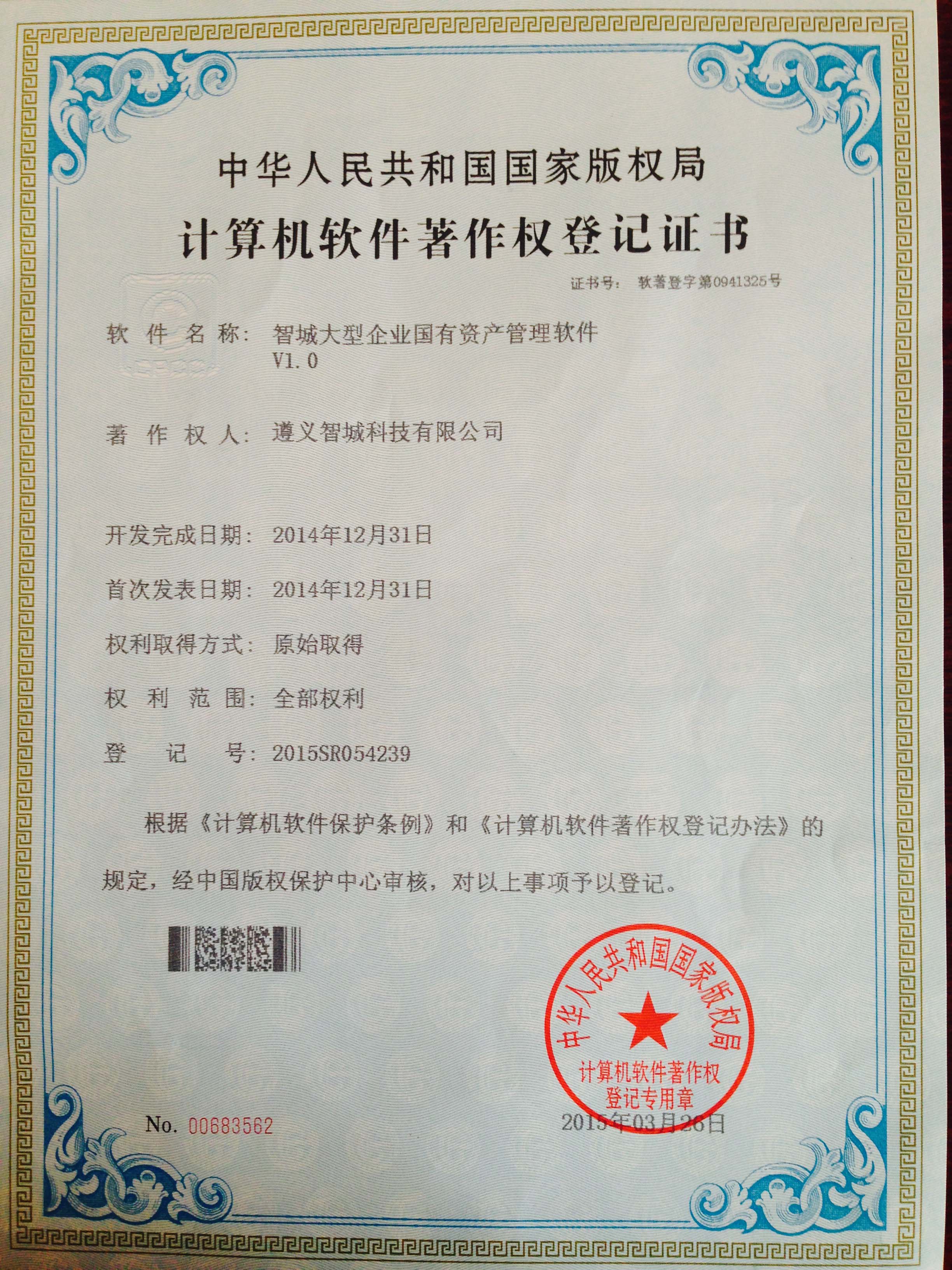 遵义智城自主研发的《智城大型企业国有资产管理软件(V1.0)》获国家计算机著作权认证 |