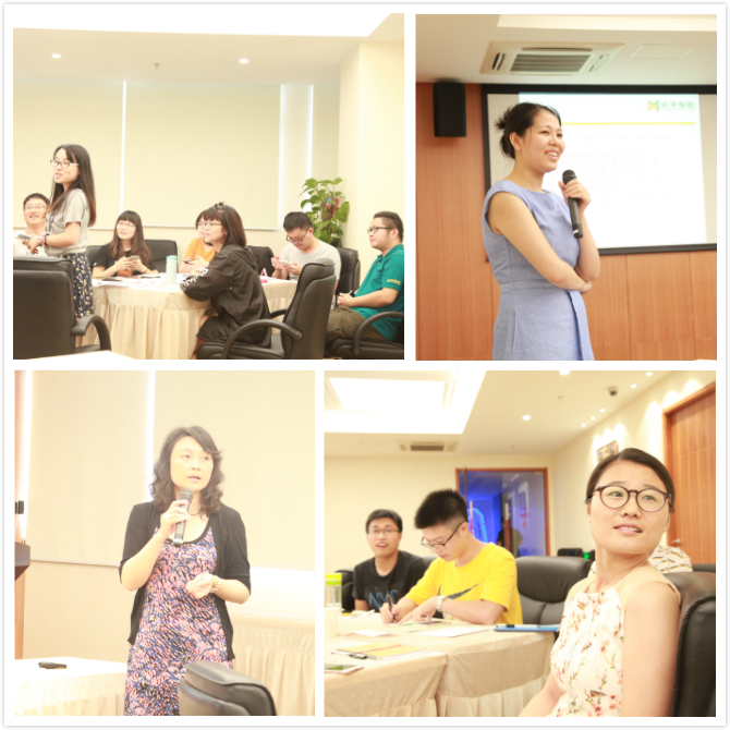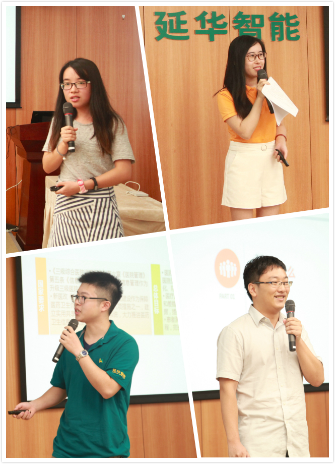 各小组根据一周的学习内容自主选题,并派出代表进行演讲阐述。梦之队小组从建筑节能概况到合同能源管理模式进行了深度介绍,案例丰富翔实;金花四加一小组着眼企业文化,详细解读了延华“智城模式”和“双创模式”,深入浅出;H₂O小组活学活用业务高管分享的“研究套路”,从研究背景、主要内容、发展趋势分享了智慧医疗的发展情况;嘉理Duang小组从新闻案例入手,声情并茂地解读了当下我国的养老形势,分析了医养结合的内涵、现状与未来。各组表现可圈可点,演讲现场亮点频现。