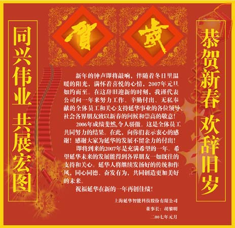 新年的钟声即将敲响,伴随着冬日里温暖的阳光,满怀着喜悦的心情,2007年元旦如约而至。在这辞旧迎新的时刻,我谨代表公司向一年来努力工作、辛勤付出、无私奉献的全体员工和关心支持延华事业的各位领导、社会各界朋友致以新春的问候和崇高的敬意! 2006年成绩斐然,令人骄傲。这是全体员工共同努力的结果。在此,向你们表示衷心的感谢!感谢大家为延华的发展不留余力的付出! 即将到来的2007年是充满希望的一年。希望延华未来的发展能得到各界朋友一如既往的支持和关心。延华人将继续发扬好的传统和作风,同心同德、奋发有为,共同创造更加美好的未来。 祝福延华在新的一年再创佳绩! 上海延华智能科技股份有限公司 董事长:胡黎明 二00七年元月