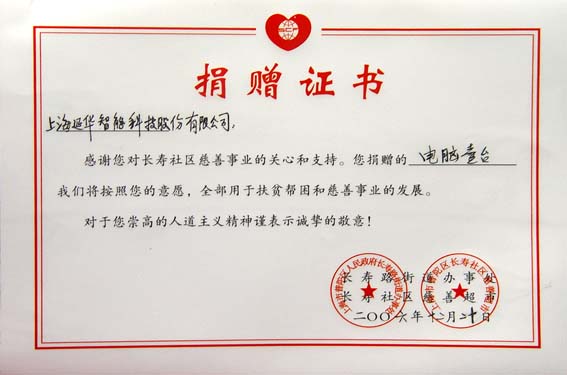 热心社会公益事业一直以来就是我司的优良传统,回顾2006年,我司多次组织志愿者参加“文明在我脚下”交通宣传整治活动,动员员工参加义务献血,组织员工参加普陀区义务工作,并多次向共建文明社区的兄弟单位长寿路街道办事处捐赠衣物、电脑、电视机等累计7261余元。日前,普陀区长寿路街道办事处为我司颁发了捐赠证书,表彰我司为扶贫帮困和慈善事业的发展所做出的贡献。 “社会和谐,企业有责”,我司从董事长到每一位员工,将“和谐”的理念与延华的发展目标相结合,自觉承担起创建和谐企业的历史使命和时代责任,并贯穿在延华的价值观、发展观和管理实践中。 “贫则独善其身,达则兼济天下”,我司将在发展企业的同时,以强烈的社会责任感,积极投身到社会公益慈善事业中来,为促进企业和谐发展,为